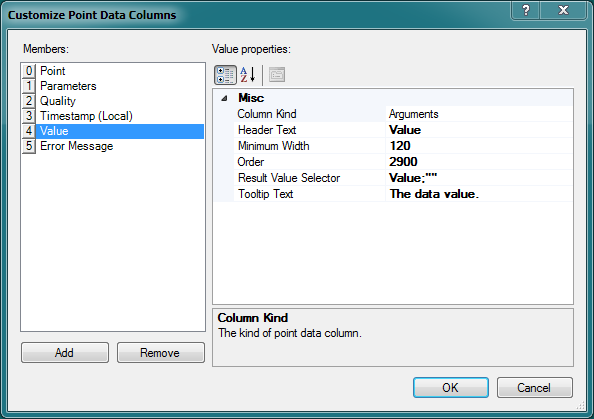 Most properties are self-explanatory, and there is also a description in the box below the property grid. Besides many properties that influence how the information will be shown, there are two important ones that dictate what will be shown: Column Kind and Result Value Selector.
