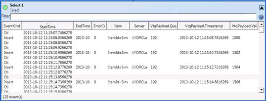 9. You can now view the events at various stages of the query processing, by clicking the downwards-pointing triangle in any of the query operators. For example, events on the “Select.1” operator may look like this: