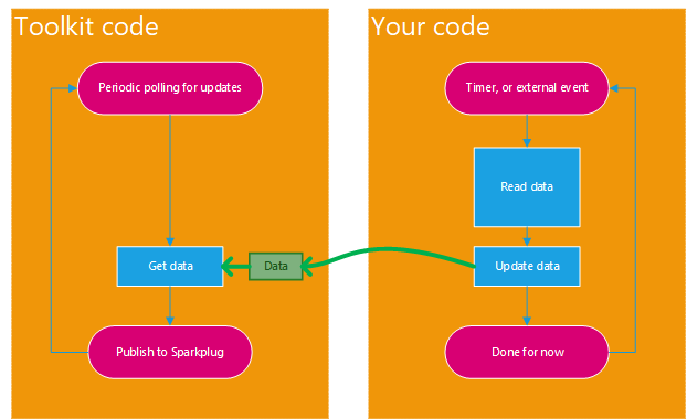 In the push data provision model, you write an independently running code that gathers the data from the underlying system and stores (pushes) it into the Sparkplug metrics. Rapid Toolkit for Sparkplug then simply uses this data whenever the data needs to be published to Sparkplug (it does so by checking for data that have changed periodically).