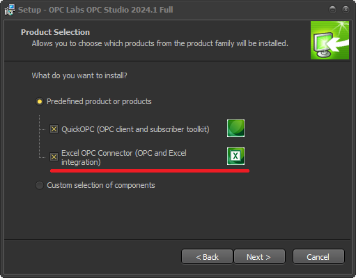 In order to have the Excel Connector installed with Connectivity Software, check the red underlined option on the Installation Product Selection page of the setup wizard: