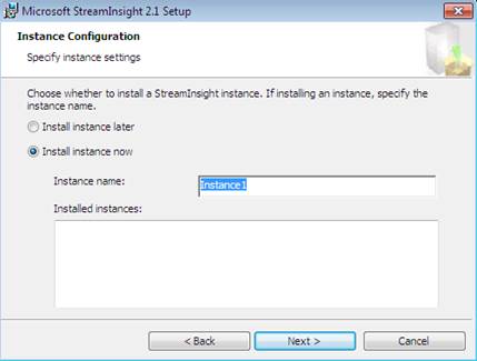 2.       Go through the installation wizard pages, accepting defaults or entering information as needed. On the “Instance Configuration” page, select “Install instance now” option, and enter “Instance1” (without the double-quotes) into the “Instance name” field. Creation of this instance is recommended now (although you can create it later), because it is the instance that we use in our examples.