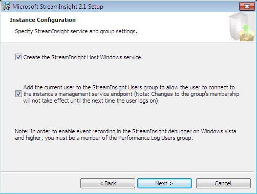 3.       Continue going through the installation wizard pages. We recommend that you check the “Add the current user to the StreamInsight Users group…” box. Finalize the installation wizard then.