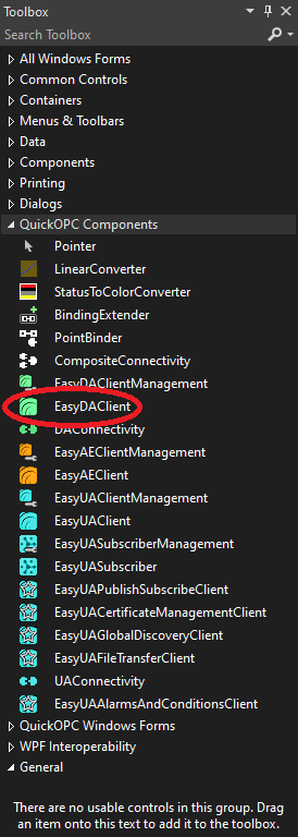 Instantiate the EasyDAClient component in the form: Drag the EasyDAClient component from the “QuickOPC Components” tab of the Toolbox to the form’s design surface.