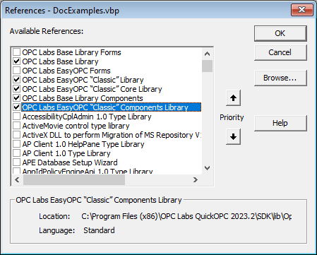 Reference the components for OPC "Classic" client development: from the menu, and in the list of available references, look for following items and check the boxes next to them: