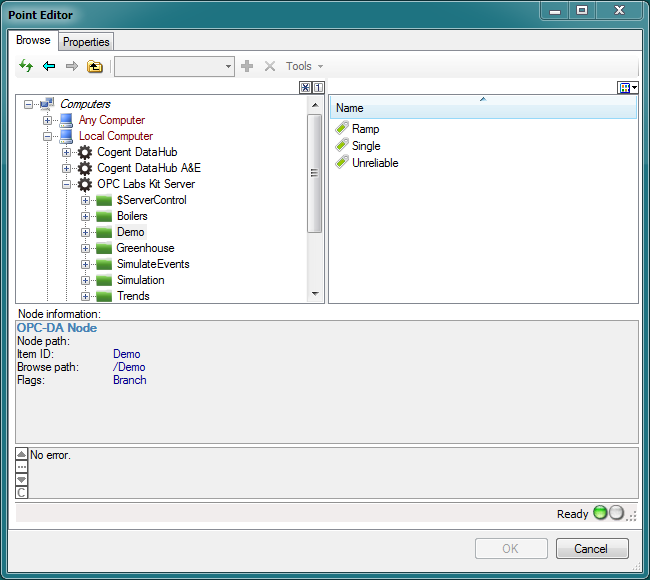 In the “Point Editor” dialog, select Computers -> Local Computer -> OPC Labs Kit Server -> Demo -> Ramp, and press .