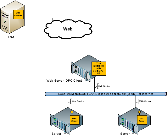 The other typical use of QuickOPC-UA is to place it on the Web server inside a Web application. The Web application provides HTML pages to the client’s browser, runs in a Web server, such as Microsoft IIS (Internet Information Server), and is written using tools and languages such as ASP.NET (using C#, Visual Basic.NET, or other .NET language).
