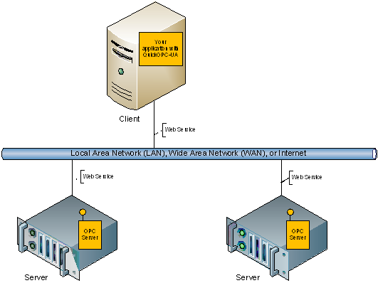 The most typical use of QuickOPC-UA involves a thick-client user application written in one of the Microsoft .NET languages. This application uses the types from QuickOPC-UA object model, and accesses data within OPC servers that are located on remote computers on the same LAN (Local Area Network) or on WAN (Wide Area Network) or on the Internet. The communication with the target OPC server is performed by means of Web Services.