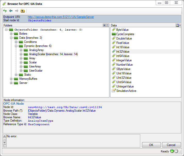 Here is an example of OPC-UA Data dialog in action: