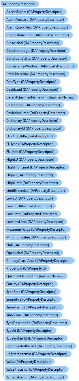 'Declaration<CLSCompliantAttribute(True)> <ComDefaultInterfaceAttribute(OpcLabs.EasyOpc.DataAccess.ComTypes._DAPropertyDescriptor)> <ComVisibleAttribute(True)> <GuidAttribute("7838BAB7-D2A5-4860-9B3F-87E4A8298823")> <TypeConverterAttribute(OpcLabs.EasyOpc.DataAccess.Implementation.DAPropertyDescriptorConverter)> <ValueControlAttribute("OpcLabs.BaseLib.Forms.Common.ObjectSerializationControl, OpcLabs.BaseLibForms, Version=5.83.477.1, Culture=neutral, PublicKeyToken=6faddca41dacb409", DefaultReadWrite=False, Export=True, PageId=10001)> <SerializableAttribute()> Public NotInheritable Class DAPropertyDescriptor Inherits OpcLabs.BaseLib.Info Implements LINQPad.ICustomMemberProvider, OpcLabs.BaseLib.ComTypes._Info, OpcLabs.BaseLib.ComTypes._Object2, OpcLabs.BaseLib.Text.IStringListSerializable, OpcLabs.EasyOpc.DataAccess.ComTypes._DAPropertyDescriptor, System.ComponentModel.INotifyPropertyChanged, System.ICloneable, System.Runtime.Serialization.ISerializable, System.Xml.Serialization.IXmlSerializable