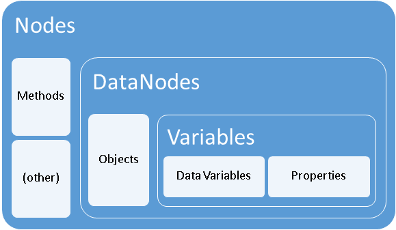 Objects (returned by the BrowseObjects method) are equivalent of folders in a file system – they provide means of organizing other nodes logically. Data variables (returned by the BrowseDataVariables method) represent a value, and clients can read the value, write the value, or subscribe to changes of the value. Properties (returned by the BrowseProperties method) represent additional characteristics of a node which is not described by its attributes. Variables (either data variables, or properties), are returned by the BrowseVariables method. The BrowseDataNodes method returns all kinds of data nodes – and we use the term data nodes for any of objects, variables, or properties.