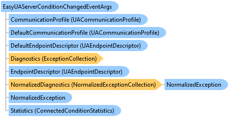 The event notification passes to you an EasyUAServerConditionChangedEventArgs object, which contains data about the new server condition. The EndpointDescriptor property identifies the server the notification applies to. The Boolean IsConnected property indicates whether the server is now connected. The Exception property contains a null reference in case of no error, or it contains an exception object in case of problems.