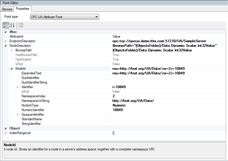 In the Properties tab, the data that describe the point are displayed in a detailed property grid. In addition, in the upper part of the tab, you can select any type of point supported by the connectivity in use, and then fill in its properties as needed.