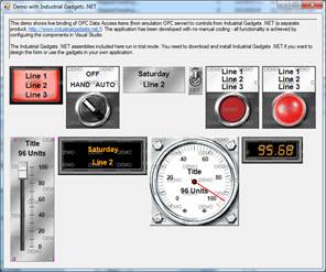 IndustrialGadgetsDemo: Shows live binding of OPC Data Access items (from simulation OPC server) to controls from Industrial Gadgets .NET (a separate product, https://www.softwaretoolbox.com/industrialgadgets/index.asp ). The application has been developed with no manual coding - all functionality is achieved by configuring the components in Visual Studio.