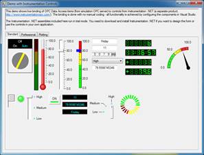 InstrumentationControlsDemo: Shows live binding of OPC Data Access items (from simulation OPC server) to controls from Instrumentation .NET (a separate product, https://www.softwaretoolbox.com/instrumentationopc/ ). The binding is done with no manual coding - all functionality is achieved by configuring the components in Visual Studio.