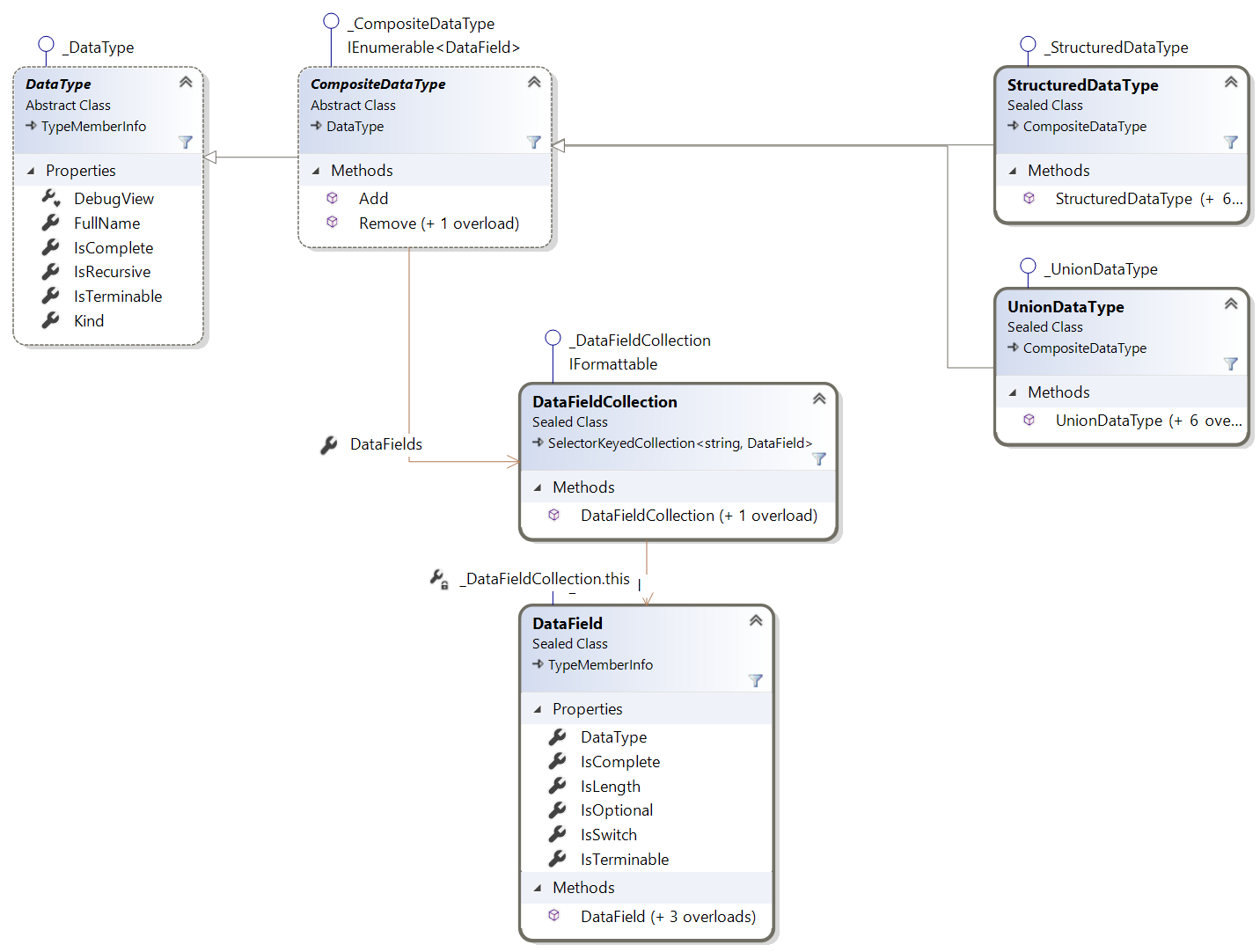 The StructuredDataType Class is an IEnumerable of DataField, and it has an Add Method for the same. It means that you can easily enumerate through its data fields, and it can also participate in collection initializers in C# or in VB.NET.