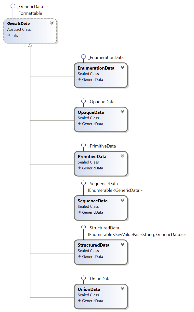 Generic data is represented by instances of types derived from the GenericData Class. The GenericData Class is a base abstract class that is concretized by its subtypes to enumerations, sequences, structures etc., as described in Generic data kinds.